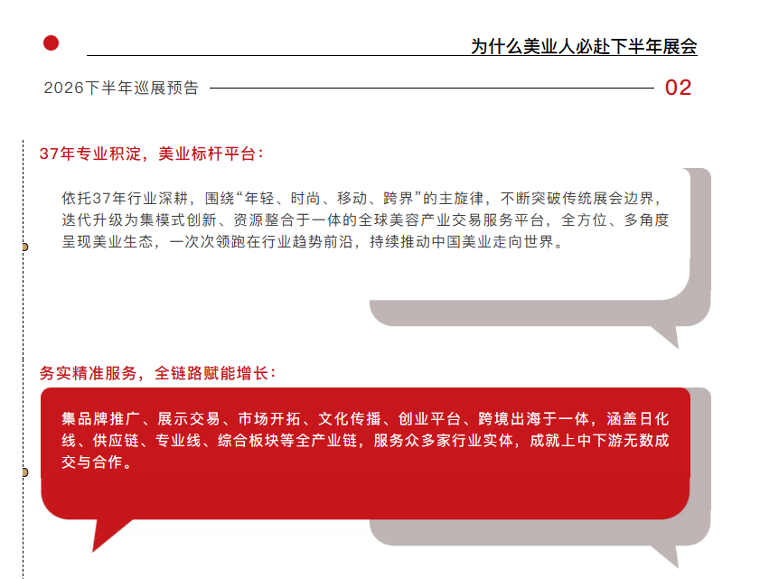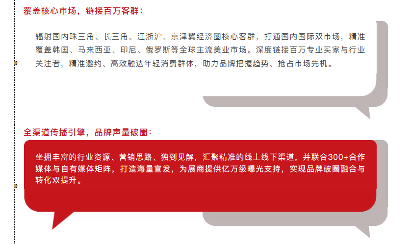 聚焦于专业美容、大健康、纤体塑形、日化等全产业链,聚集全世界高端展商、买家和业内专业人士,配以10+场精彩活动,以“突破B端、直面C端"的新思路,以“细分支、精品类、强矩阵"为主打,为新消费时代传统企业转型升级提供了新出路。